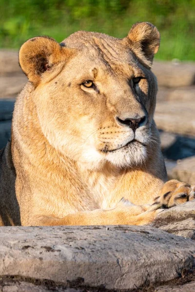 Mujer Leona Sentada En Una Roca Imagen de archivo - Imagen de cara, sabana: 216537089