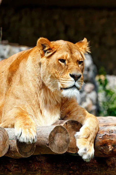 Retrato De Una Leona Sentada En Una Roca En El Zoológico Fotos, retratos, imágenes y fotografía de archivo libres de derecho. Image 202356713