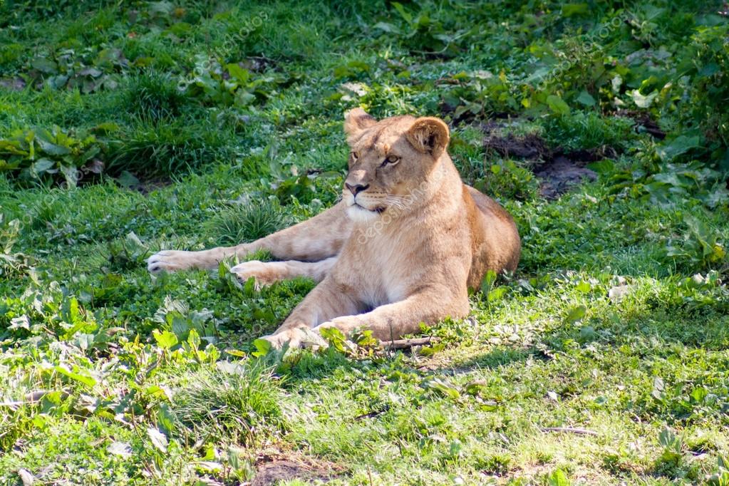 Leona Sentada Sobre La Hierba En El Zoológico. León Femenino Tendido En El Suelo. Foto de archivo - Imagen de mentira, bestia: 192357632