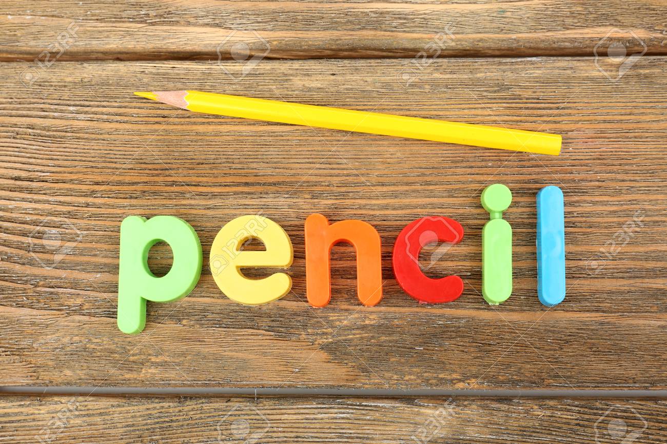 Lápiz Palabra Formada Con Letras De Colores En El Fondo De Madera Fotos, retratos, imágenes y fotografía de archivo libres de derecho. Image 33816299