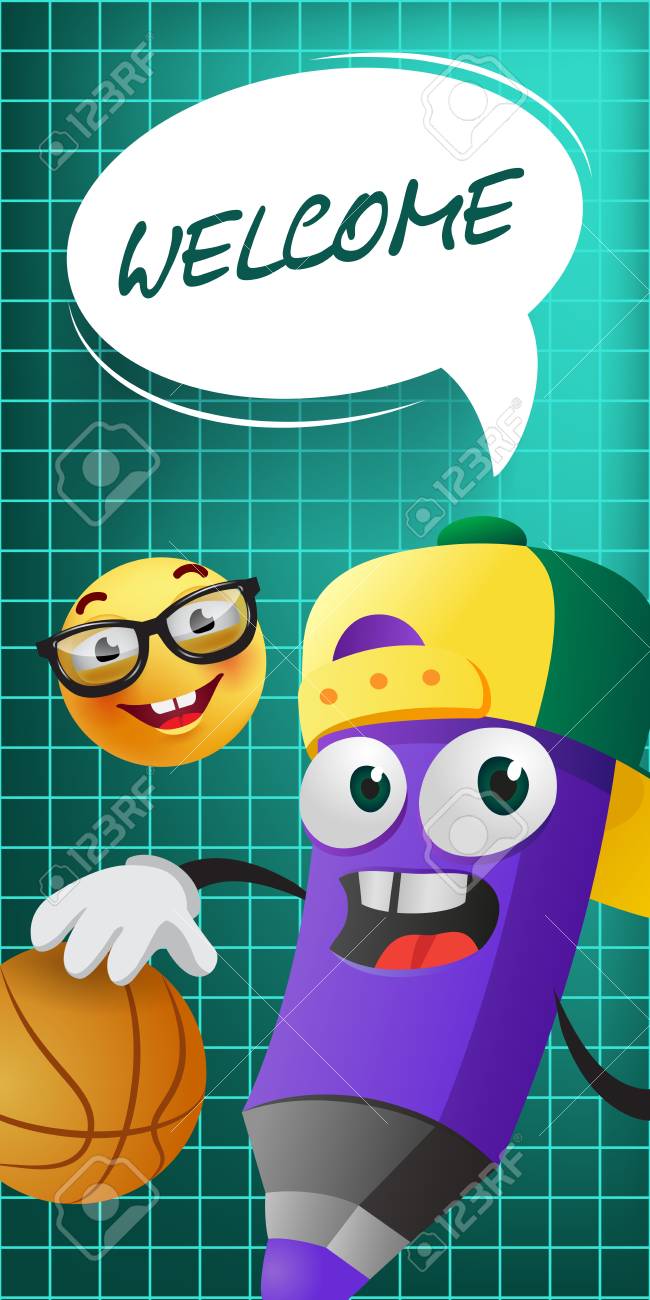 Letras De Bienvenida Con Personaje De Lápiz De Dibujos Animados Y Baloncesto. Diseño Publicitario De Oferta O Venta. Texto Escrito A Mano, Caligrafía. Para Folletos, Folletos, Invitaciones, Carteles O Pancartas. Ilustraciones svg,
