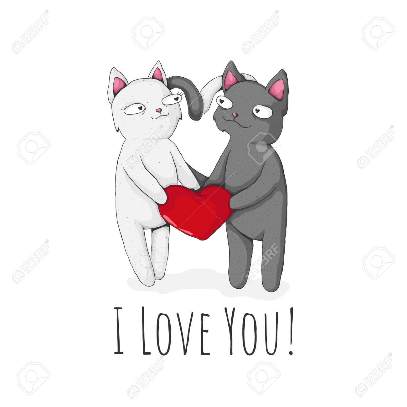 Dos Lindos Gatos Con Corazón Rojo Con Texto Te Amo. Concepto Del Día De San Valentín. Ilustración De Dibujos Animados Vectoriales. Lo Mejor Para Diseño Impreso, Textil O Web. Ilustraciones svg, vectoriales,