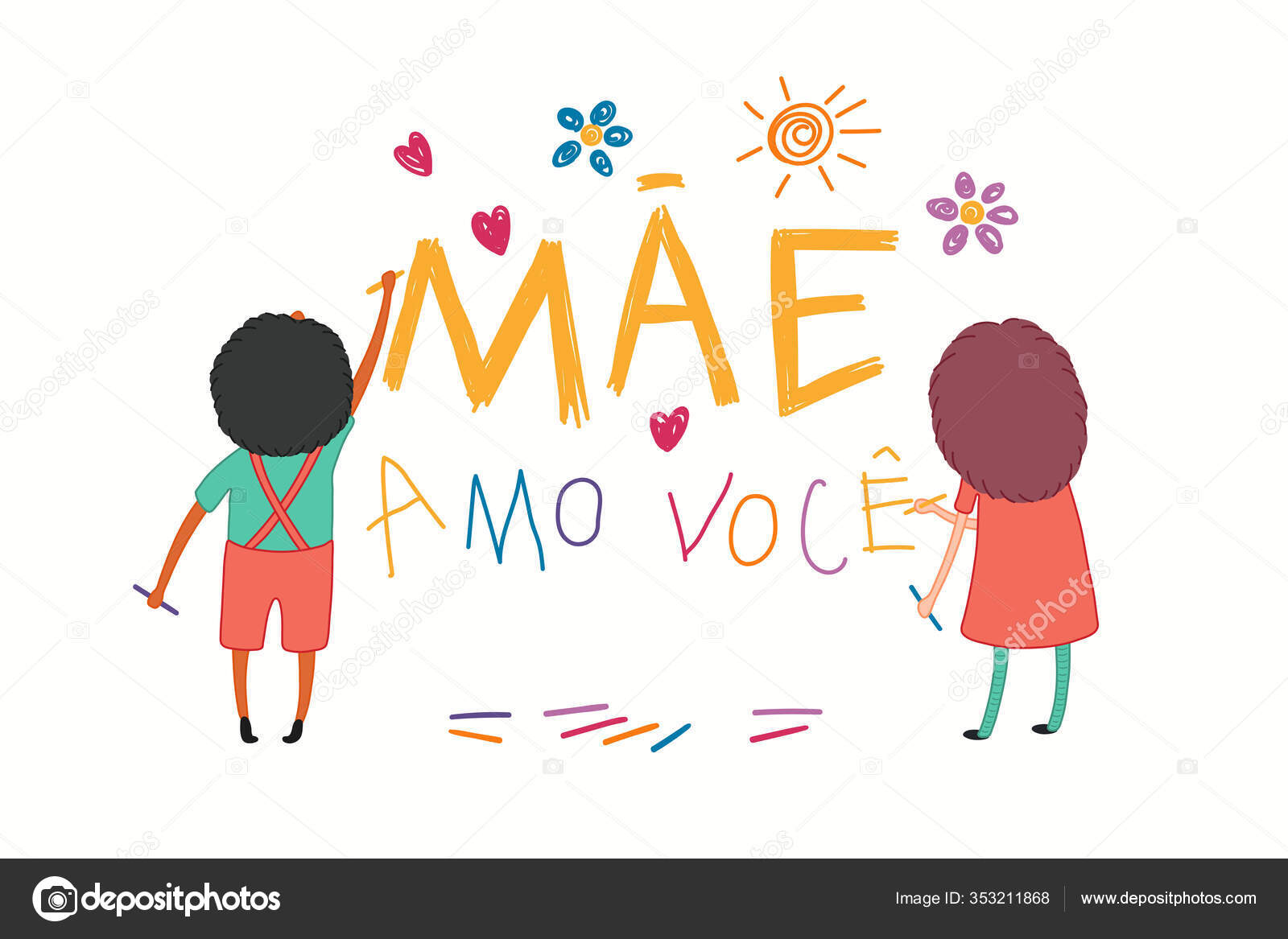 Tarjeta Del Día De La Madre Con Niños Lindos De Dibujos Animados, Niña Y Niño, Dibujo Con Crayones, Texto En Italiano Ti Amo Mamma, Te Amo Mamá. Aislado En Blanco. Ilustración De