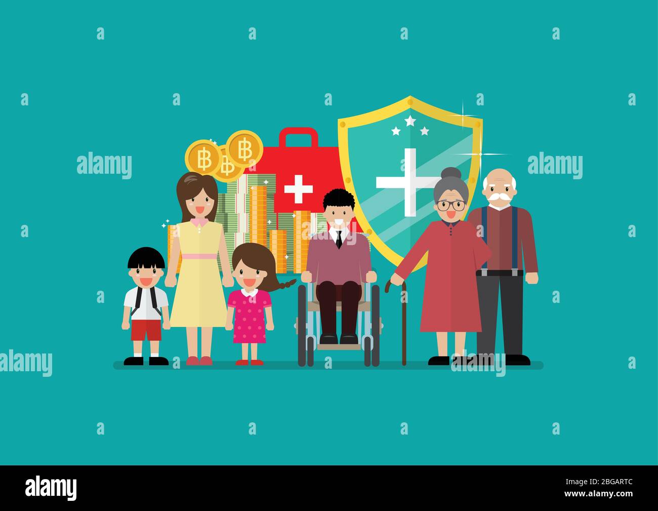 Bienestar social para los niños mujeres mayores y discapacitados. Ilustración vectorial Imagen Vector de stock - Alamy