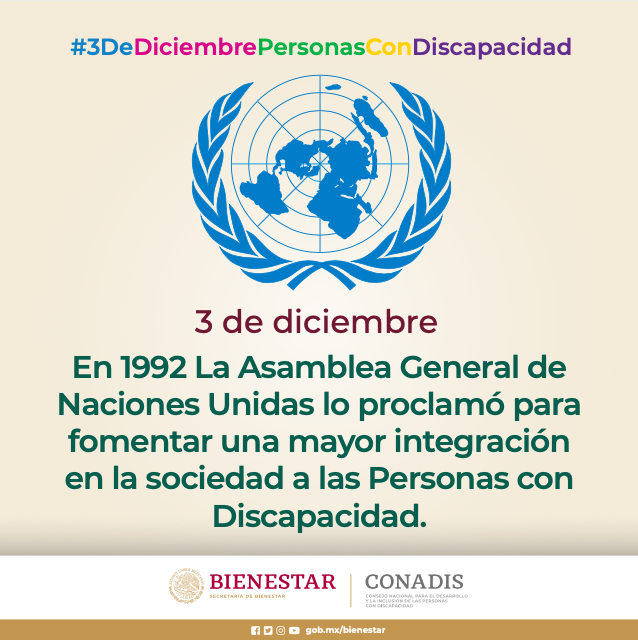 Conadis_mx on X: "#3DeDiciembrePersonasConDiscapacidad en 1992 la Asamblea General de Naciones Unidas lo proclama para promover y proteger los derechos de las personas con discapacidad, así como fomentar su integración en la