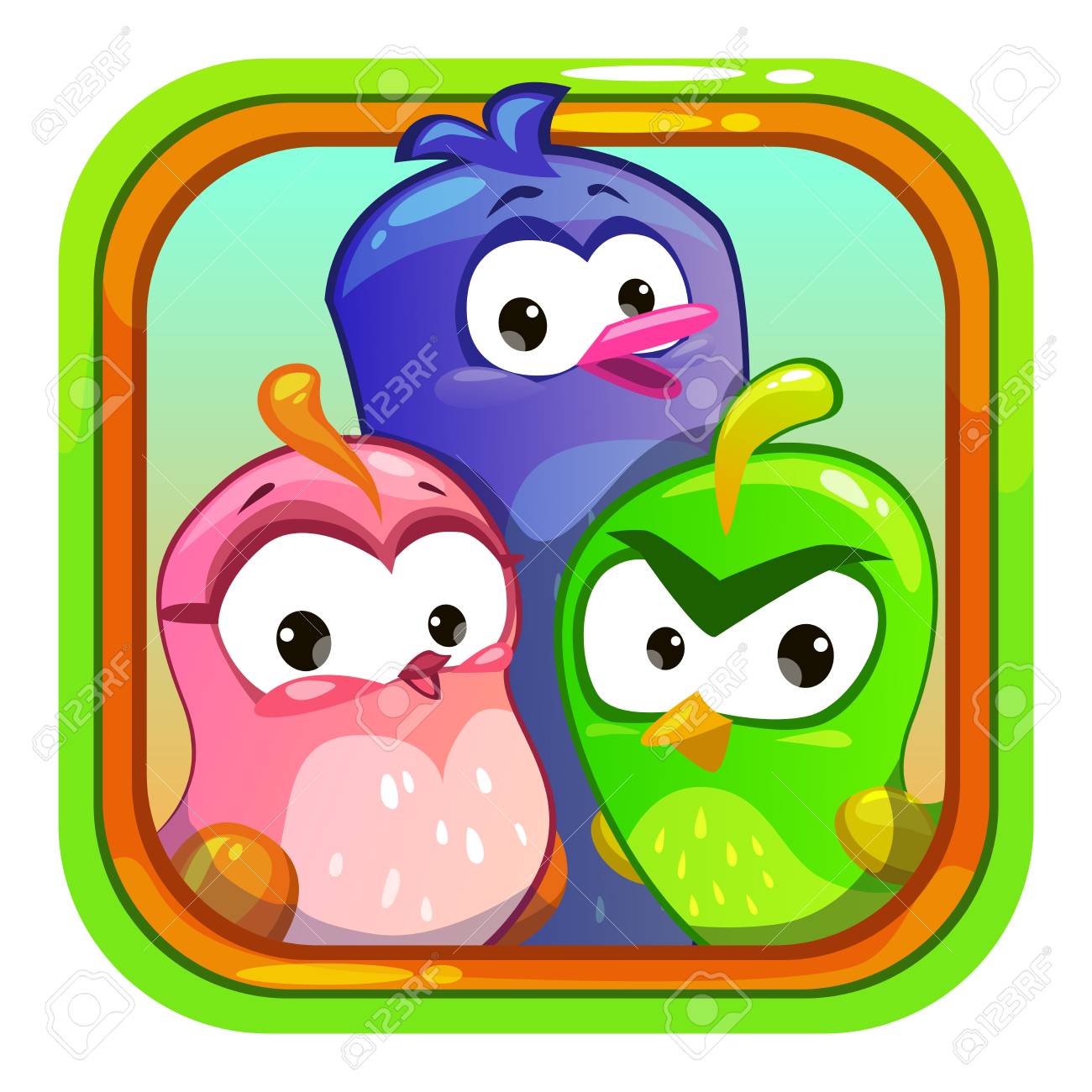 Lindo Elemento De Logotipo De Tienda De Aplicaciones. Icono De La Aplicación De Juego De Vector Con Divertidos Personajes De Dibujos Animados De Aves. Ilustraciones svg, vectoriales, clip art vectorizado libre de