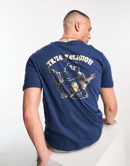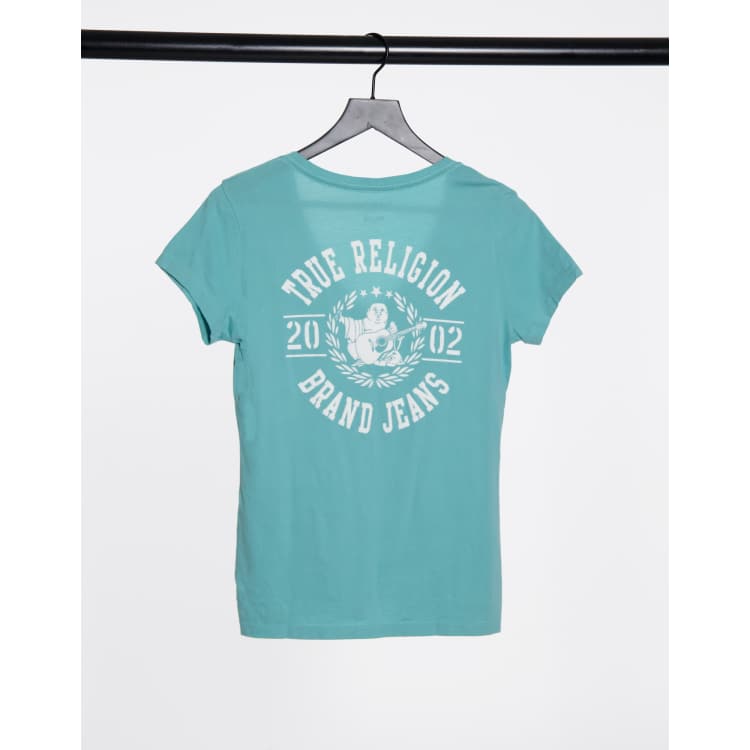 Camiseta azul con cuello de pico y logo de True Religion | Cra-wallonieShops