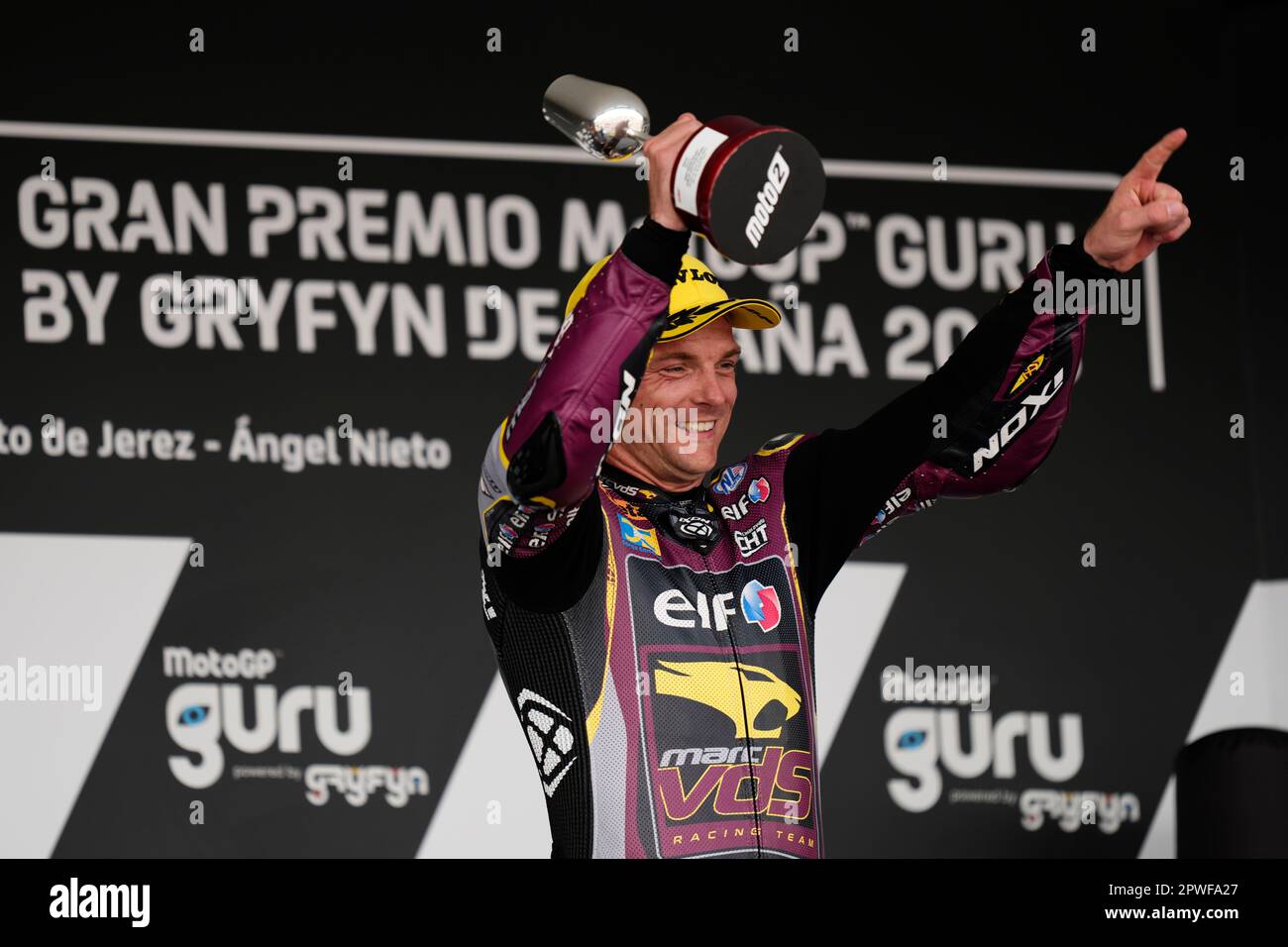 Britain's Sam Lowes celebrates winning the Moto 2 race at the Circuito de Jerez in Jerez de la Frontera, Spain, Sunday, April 30, 2023. (AP Photo/Jose Breton Stock Photo - Alamy