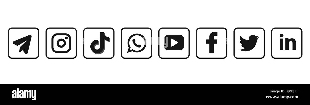 Los iconos del logotipo negro de las redes sociales establecen facebook, twitter, instagram, youtube, reddit, telegram, linkedin, whatsapp, teams, quora, messenger, skype, snapchat, pinterest, tiktok, vk, eps vectoriales editables. 9587043 Vector en