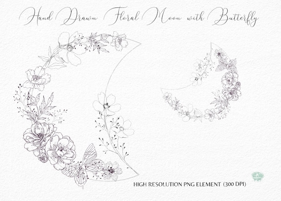 Crescent Floral Moon Clip Art Border Frame PNG Luna floral dibujada a mano en blanco y negro con mariposa Imágenes prediseñadas, Arte lineal, Uso comercial - Etsy España