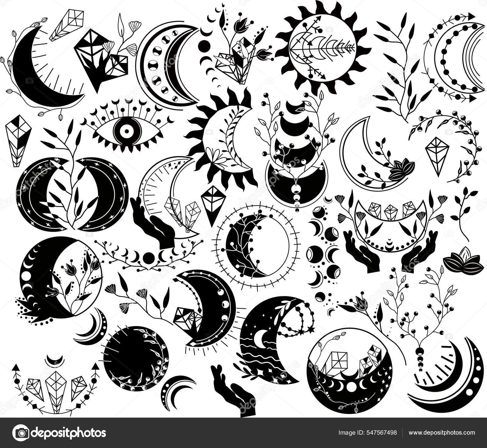 Luna celestial. Fase lunar en blanco y negro con flor. Luna mística boho, cristal, sol, flores. Clipart de luna bruja. Símbolo de Ramadán. Ilustración vectorial. Vector de stock por ©Usis 547567498