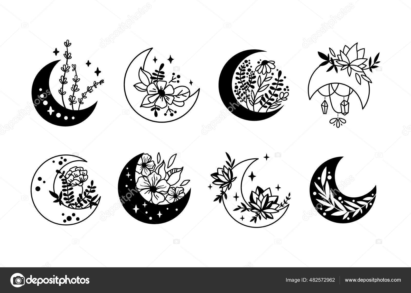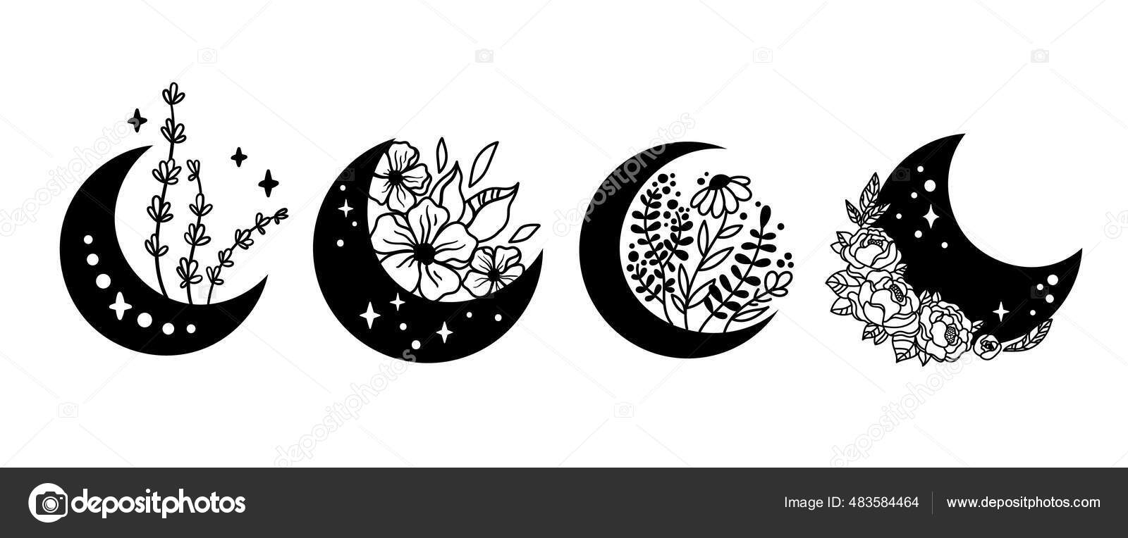 Floral moon clipart. Moon phase flowers set. Black moon elements. Celestial crescent flower logo. Hand drawing ilustración de Stock | Adobe Stock