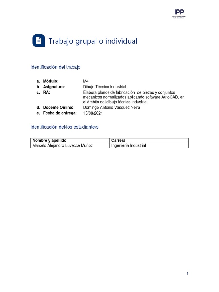 Mauricio CRUZ TI M4 Dibujo Tecnico Industrial - Trabajo grupal o individual Identificación del - Studocu