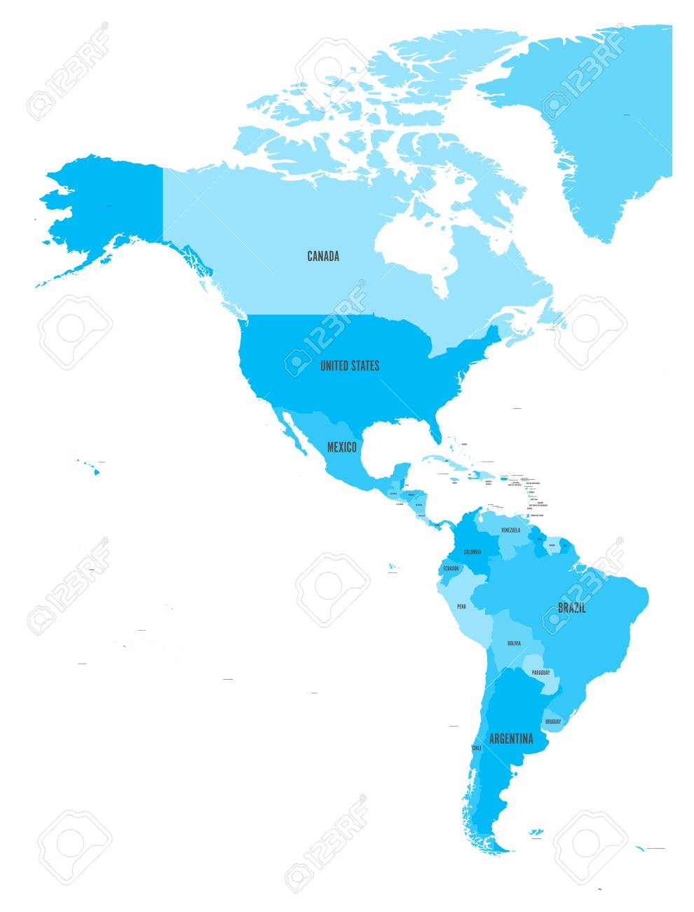 Политическая Карта Америки В Четырех Оттенках Синего Цвета На Белом Фоне. Северная И Южная Америка С Ярлыками Страны. Простая Плоская Векторная Иллюстрация. Клипарты, SVG, векторы, и Набор Иллюстраций Без Оплаты Отчислений. Image