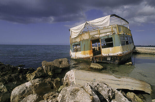 Bildagentur | mauritius images | Jamaica, Negril, rock coast, shipwreck, Caribbean, big Antilles, South Negril Point, Caribbean sea, Atlantic, Atlantic ocean, coast, rocks, walls, ship, pleasure boat, tourist boat, wreck, damages, Sturmschaden