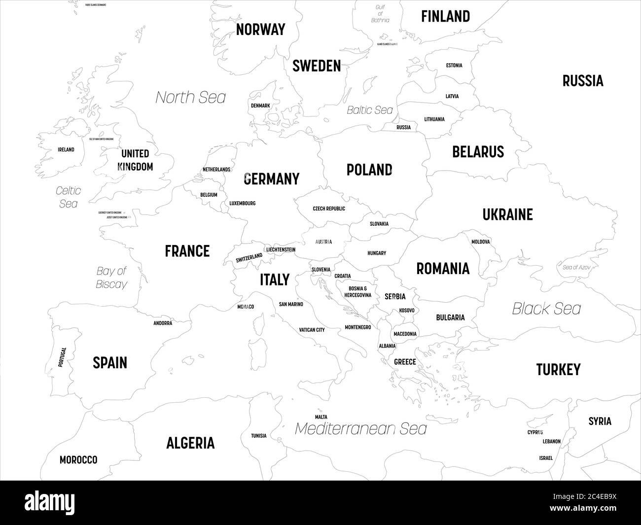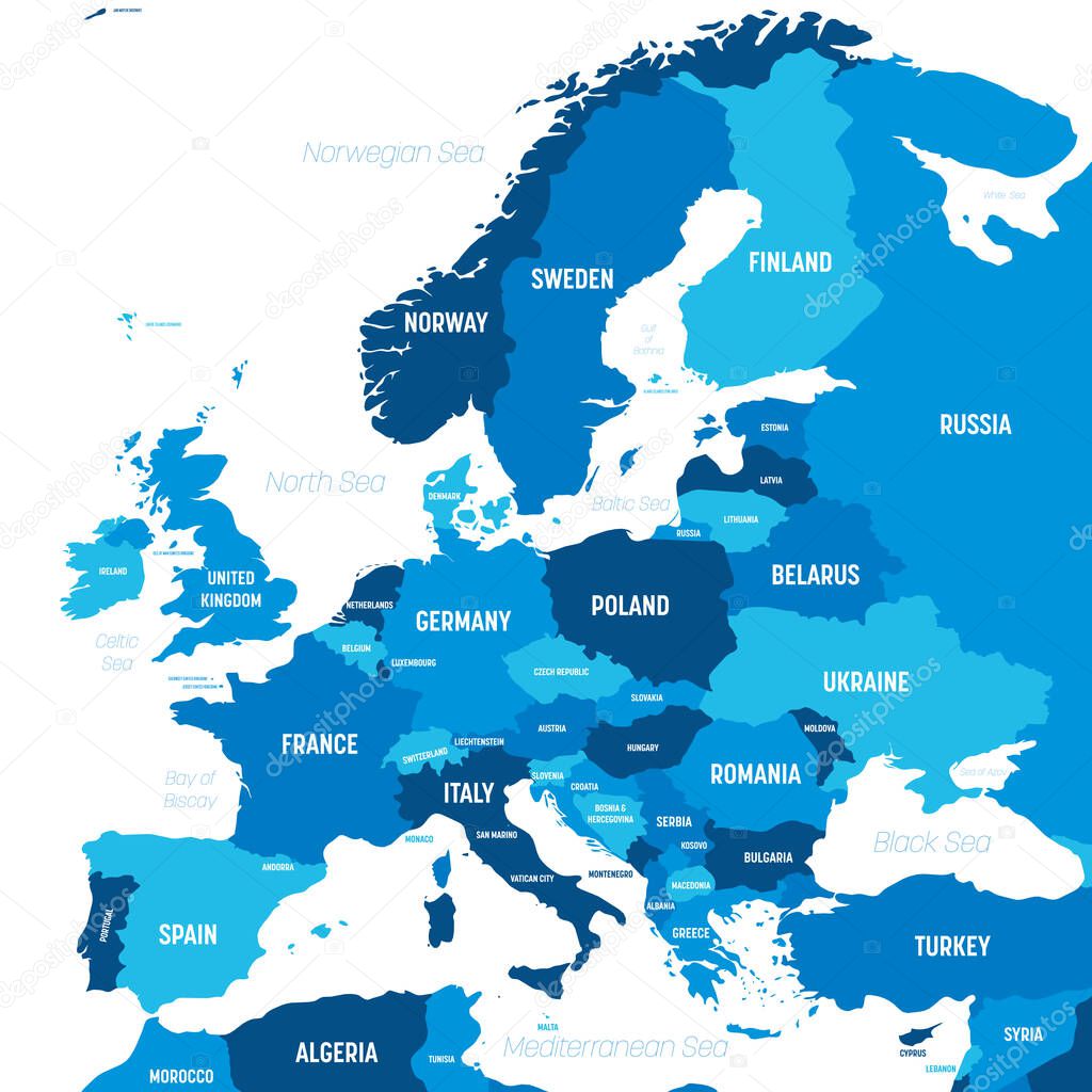 Mapa de Europa. Mapa político de alto nivel de detalle del continente europeo con etiquetado de nombres de países, capitales, océanos y mares Imagen Vector de stock - Alamy