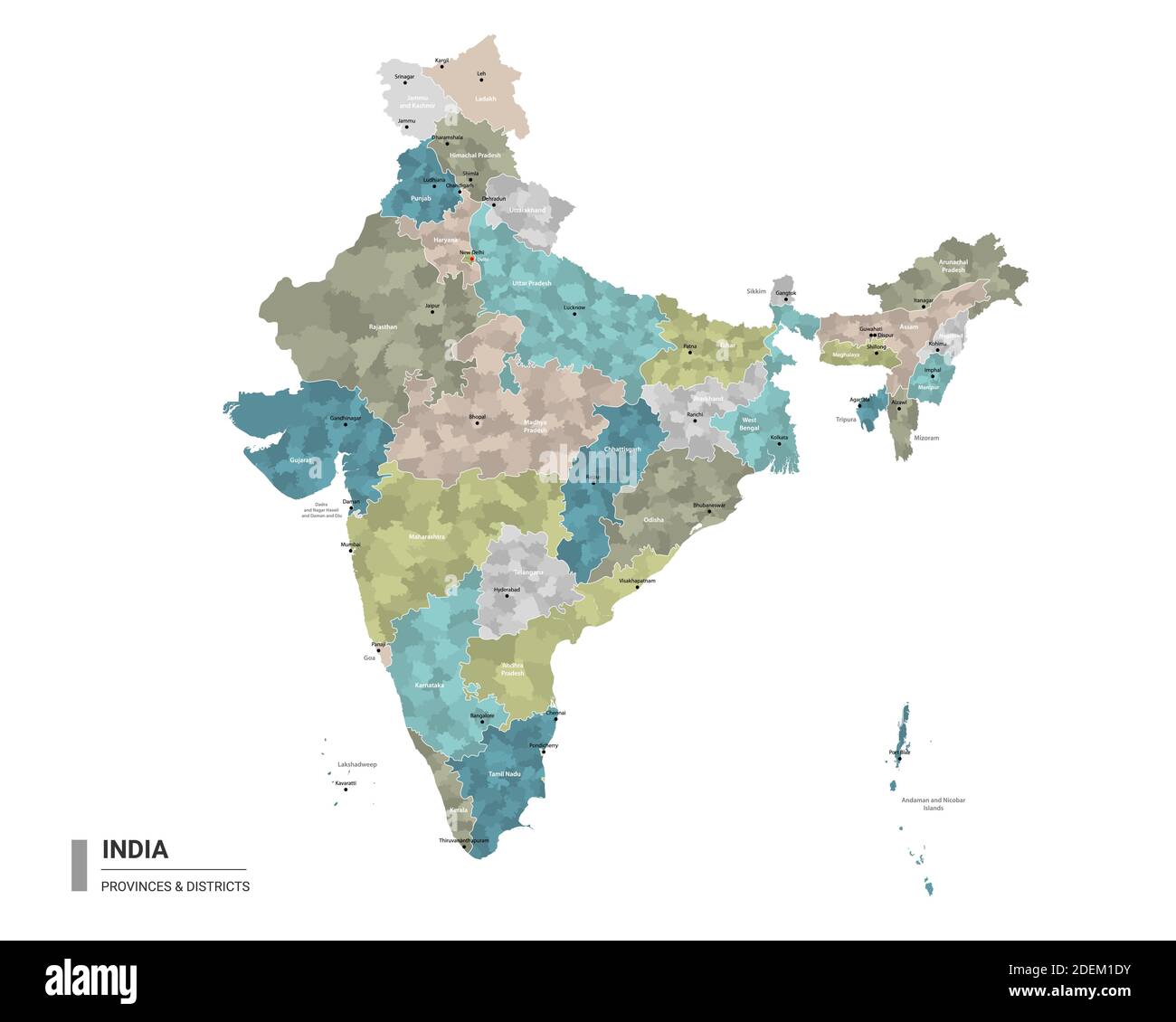 India HIGT mapa detallado con subdivisiones. Mapa administrativo de la India con nombre de distritos y ciudades, coloreado por estados y distritos administrativos Imagen Vector de stock - Alamy