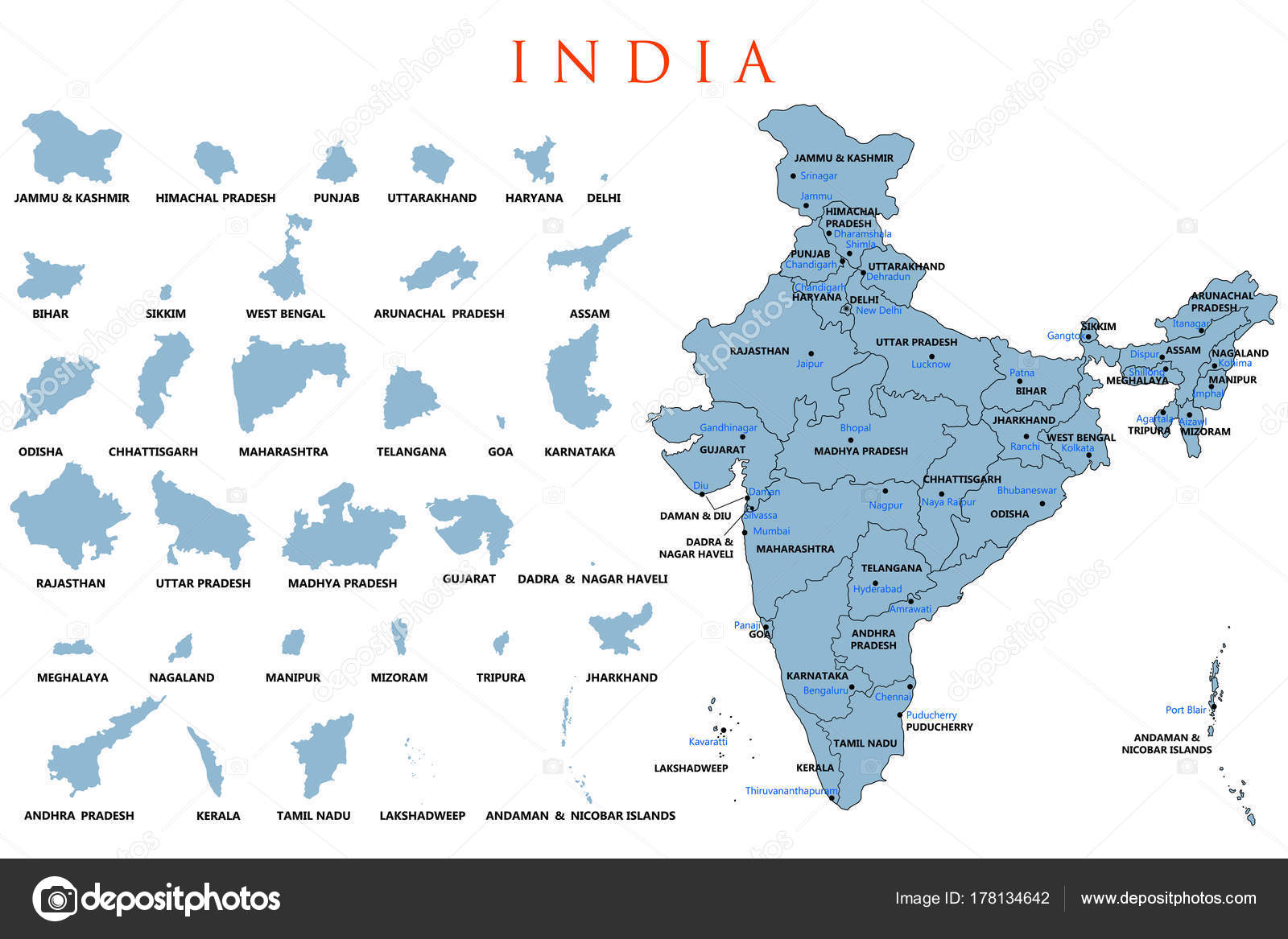 Capital De Estados Y Ciudades De India. Ciudades Populares De India. Nombre De Estados Indios. Nombre De Ciudades Indias. Mapa Ant Imagen editorial - Ilustración de vacaciones, editable: 177879925