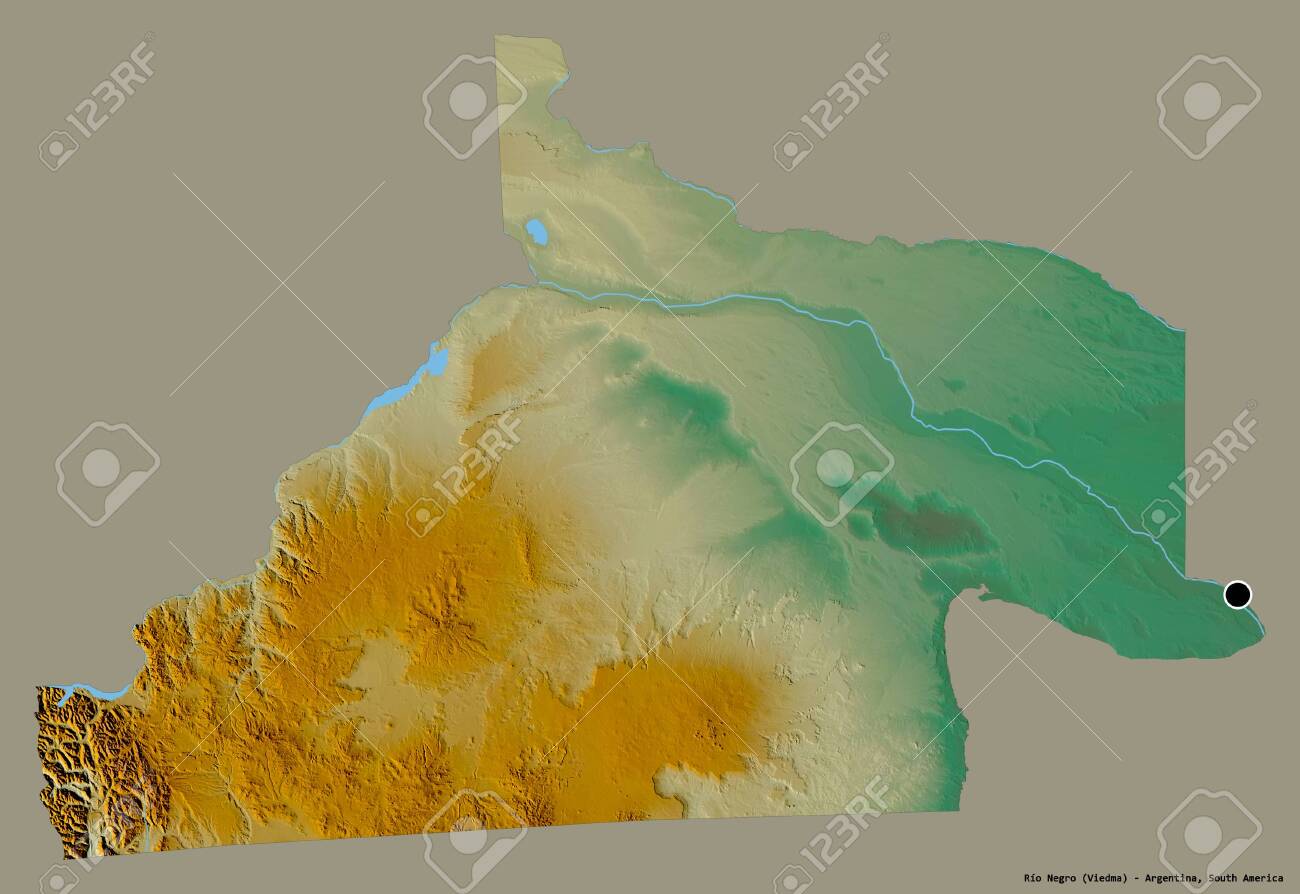 Shape Of Río Negro, Province Of Argentina, With Its Capital Isolated On A Solid Color Background. Topographic Relief Map. 3D Rendering Фотография, картинки, изображения и сток-фотография без роялти. Image 153674428