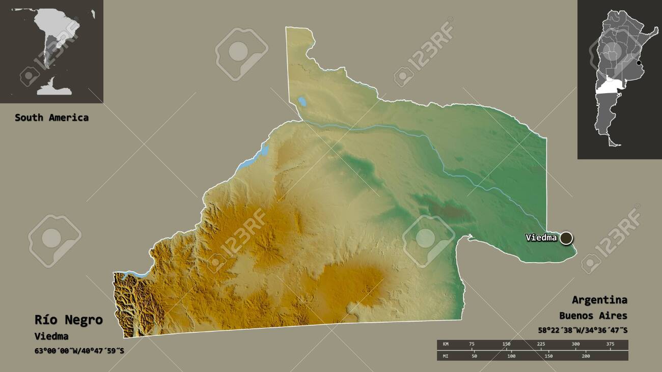 Shape Of Río Negro, Province Of Argentina, And Its Capital. Distance Scale, Previews And Labels. Topographic Relief Map. 3D Rendering Фотография, картинки, изображения и сток-фотография без роялти. Image 153674698