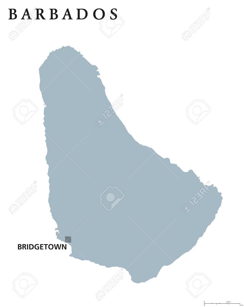 Mapa Político De Barbados Con La Capital Bridgetown. País De La Isla Soberana En Las Antillas Menores En Las Américas. Ilustración Gris Aislado Sobre Fondo Blanco. Etiquetado Inglés. Vector. Ilustraciones svg, vectoriales,