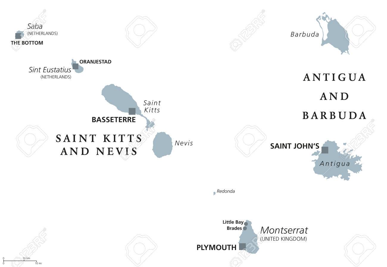 San Cristóbal Y Nieves, Antigua Y Barbuda, Montserrat, Saba Y Sint Eustatius Mapa Político.Islas Caribeñas Y Partes De Las Antillas Menores. Ilustración Gris Sobre Blanco. Etiquetado Inglés. Vector Ilustraciones svg, vectoriales, clip
