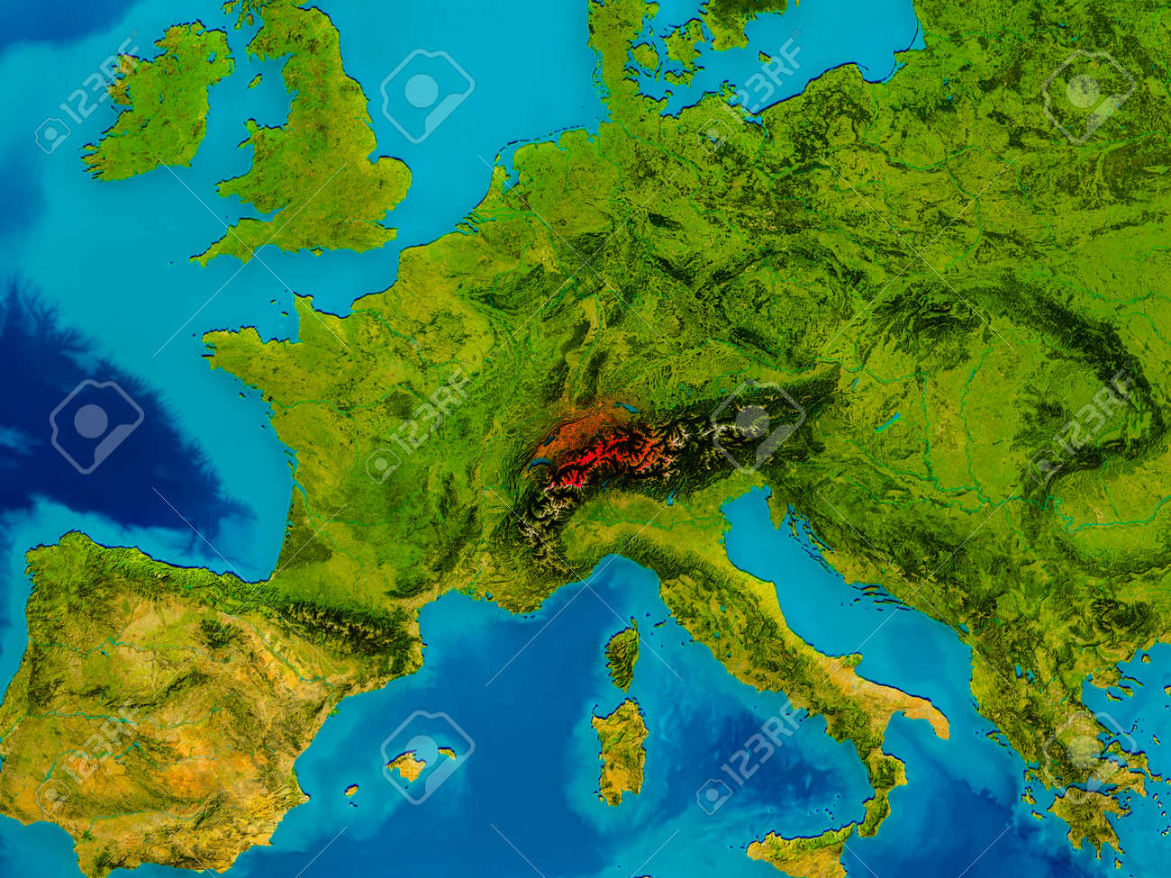Suiza Destacó En Rojo En El Mapa Físico. Ilustración 3D. Fotos, retratos, imágenes y fotografía de archivo libres de derecho. Image 77614494