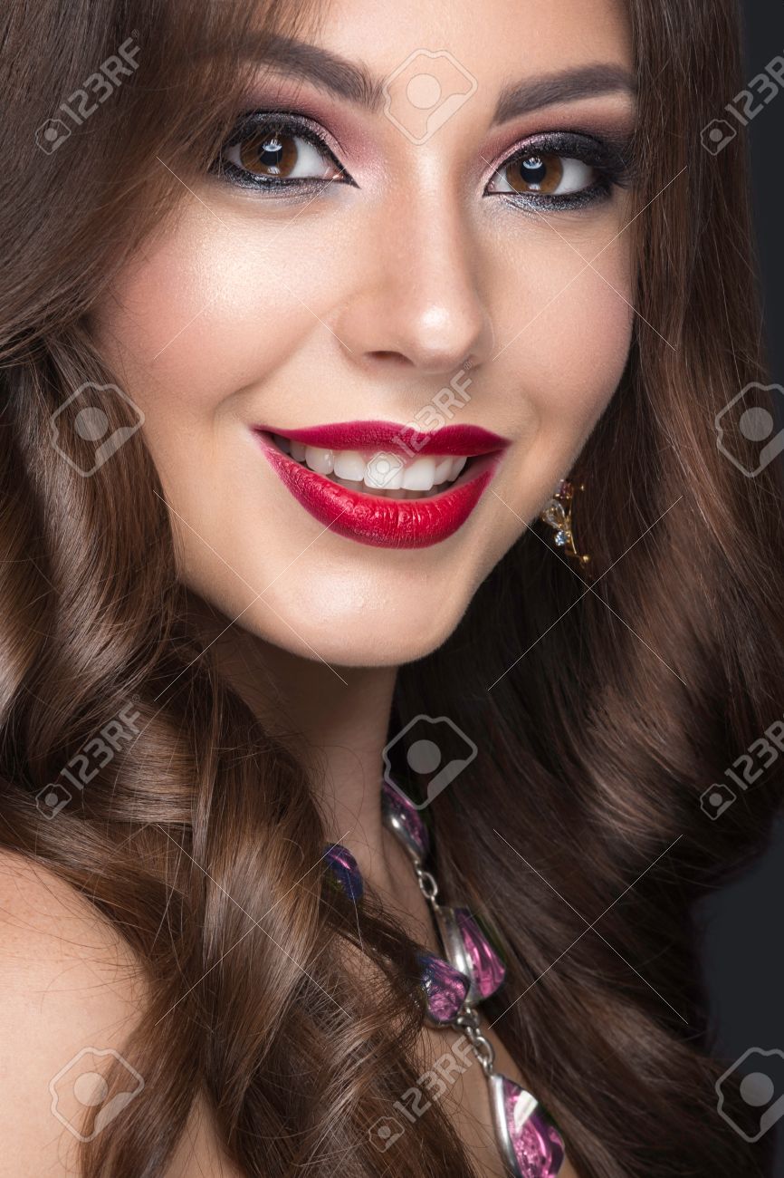 Mujer Hermosa Con Maquillaje Árabe, Labios Rojos Y Rizos. Cara De La Belleza. Fotografía Tomada En El Estudio Sobre Un Fondo Gris. Fotos, retratos, imágenes y fotografía de archivo libres de derecho.