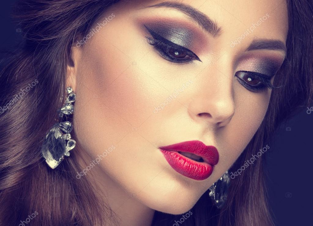 Hermosa mujer con maquillaje árabe, labios rojos y rizos. Cara de belleza. Foto tomada en el estudio sobre un fondo gris Fotografía de stock - Alamy