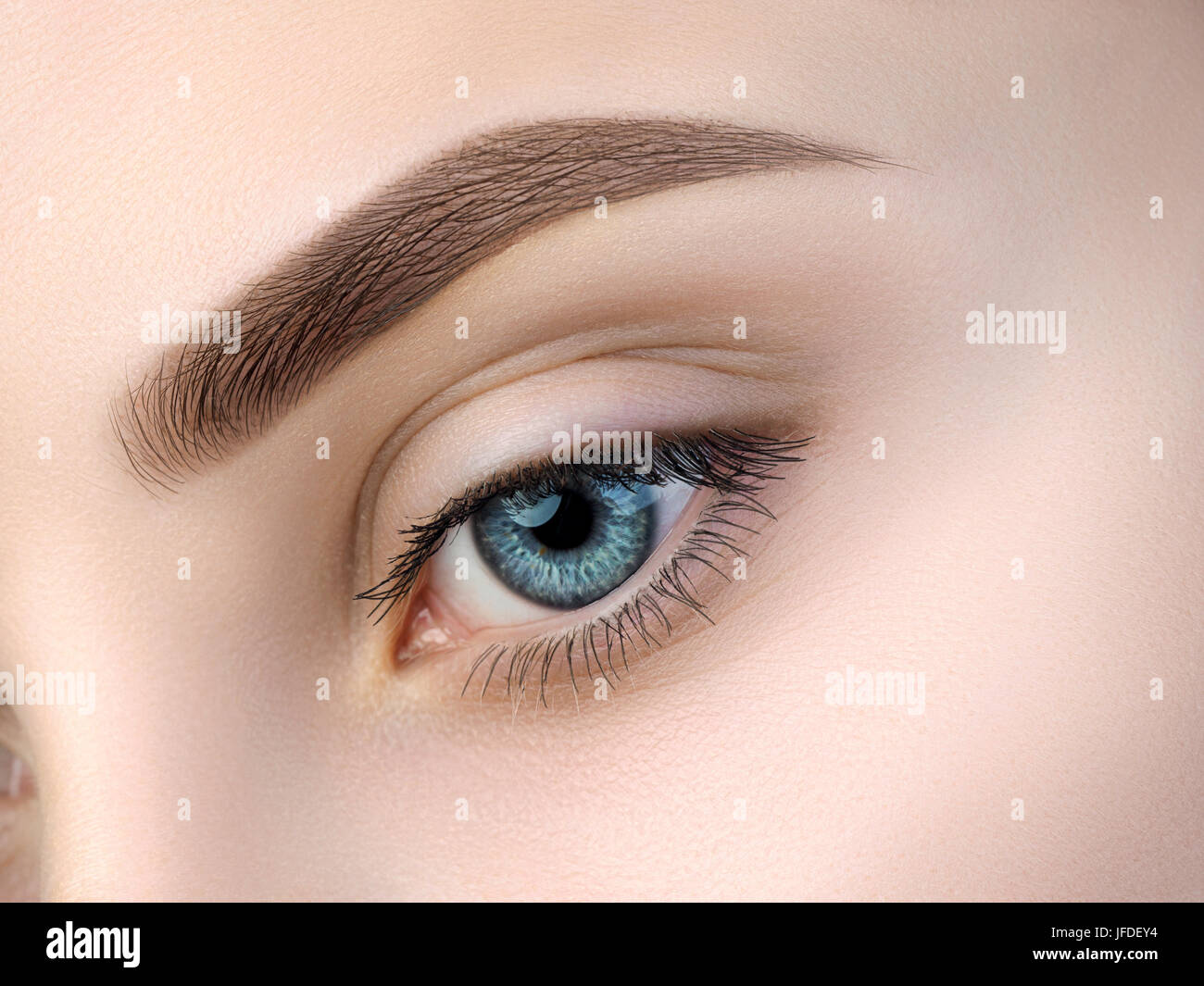 Vista de cerca del hermoso azul ojo femenino. Cejas de moda perfecto. Buena visión, lentes de contacto, brow bar de moda o concepto de maquillaje de cejas Fotografía de stock - Alamy