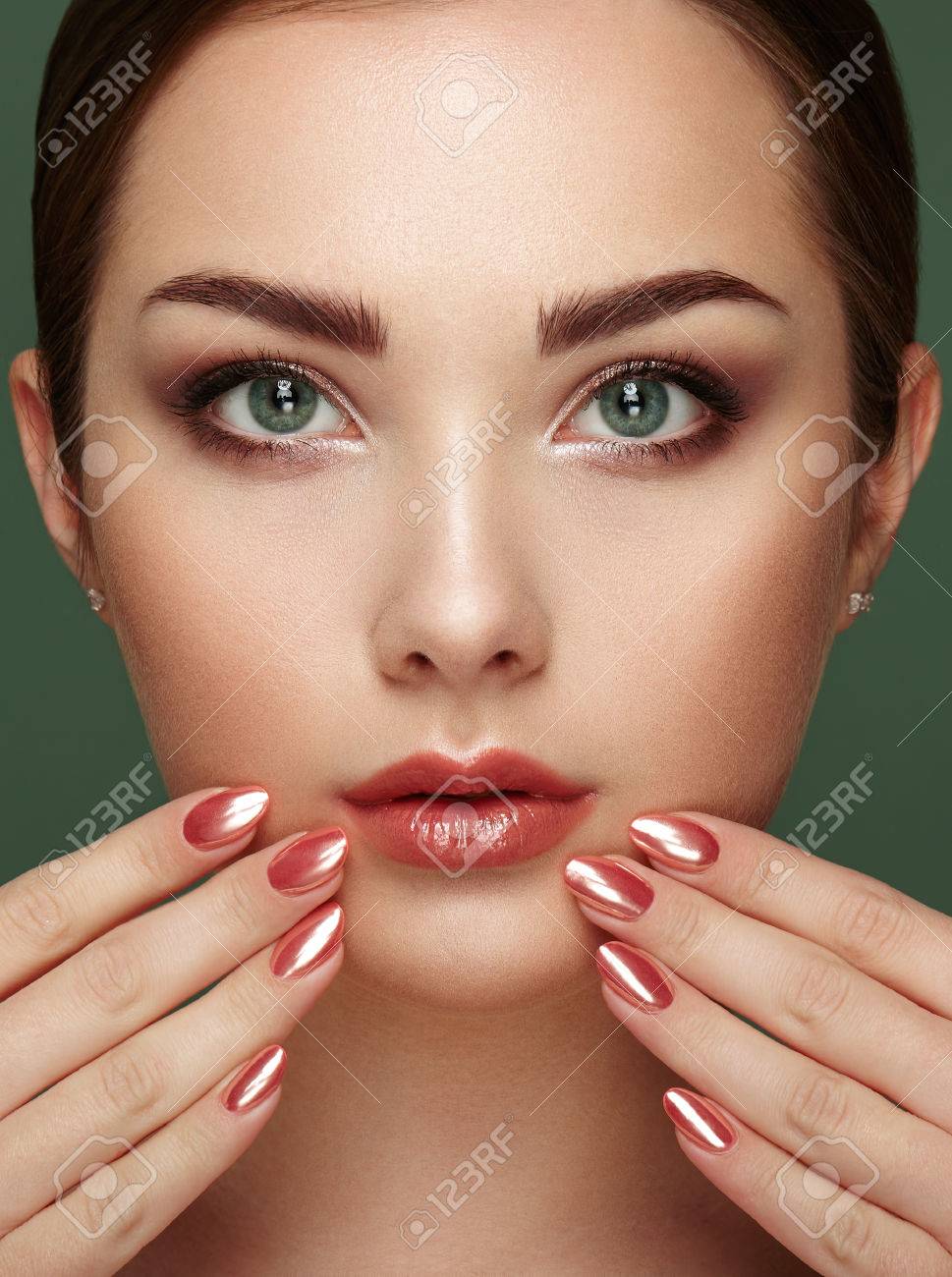 Mujer Morena De Belleza Con Maquillaje Perfecto. Chica Glamour. Labios Rojos Y Uñas. Las Cejas Perfectas. Fundación Cuidado De La Piel. Muchachas De La Belleza Cara Aislada En El Fondo Verde. Foto