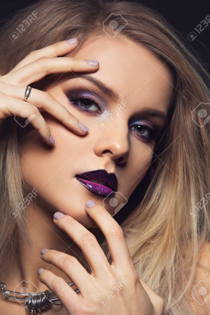 Hermosa Mujer Joven Con Maquillaje De Ojos Morado Oscuro Y Labios. Moderno Cabello Rubio Y Esponjoso Estilo. Studio Belleza Disparó Sobre Fondo Negro. Copia Espacio Fotos, retratos, imágenes y fotografía de archivo