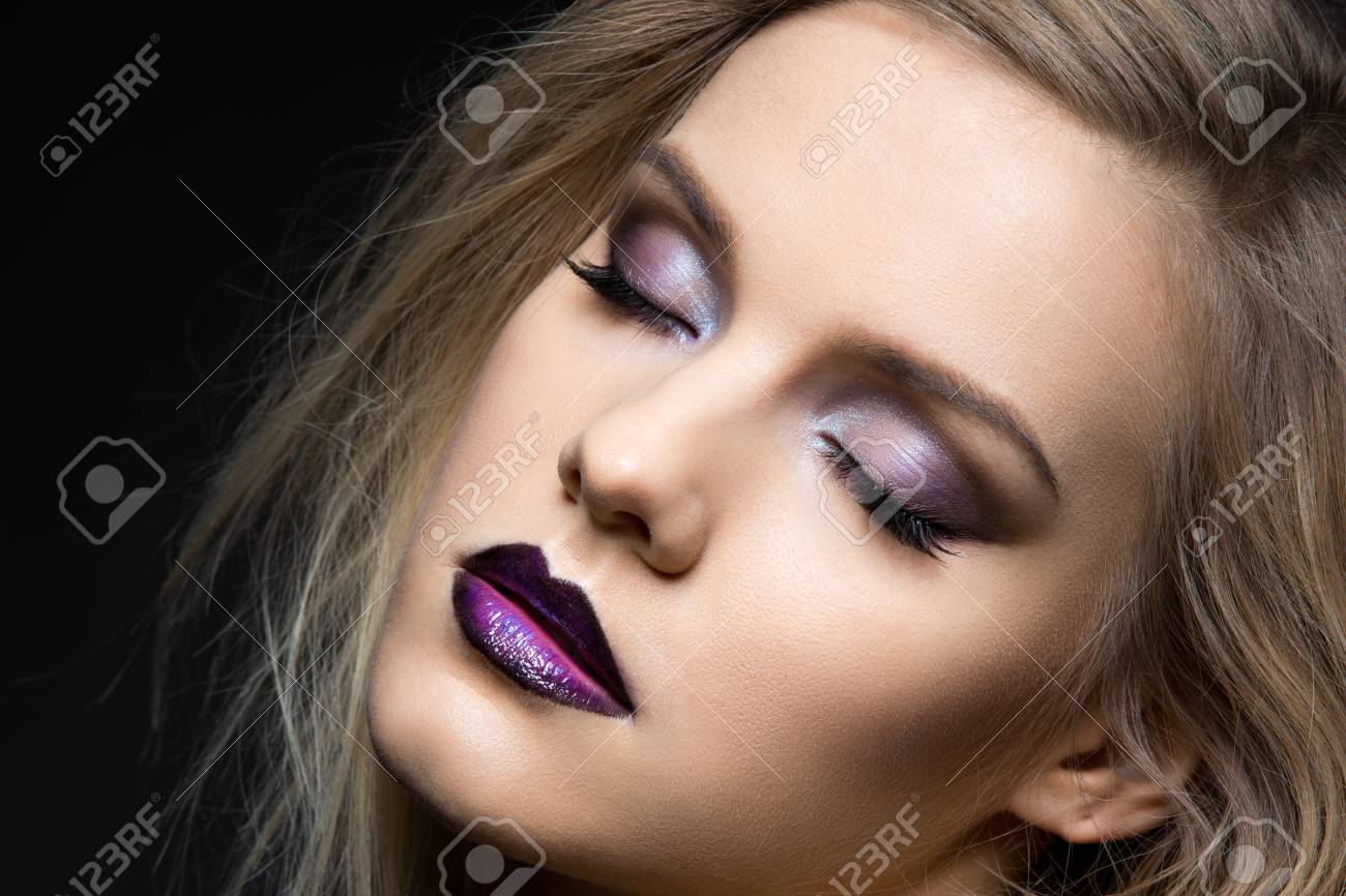 Hermosa Mujer Joven Con Maquillaje De Ojos Morado Oscuro Y Labios. Moderno Cabello Rubio Y Esponjoso Estilo. Belleza Del Estudio Del Primer Tirada Sobre Fondo Negro. Copia Espacio Fotos, retratos, imágenes y