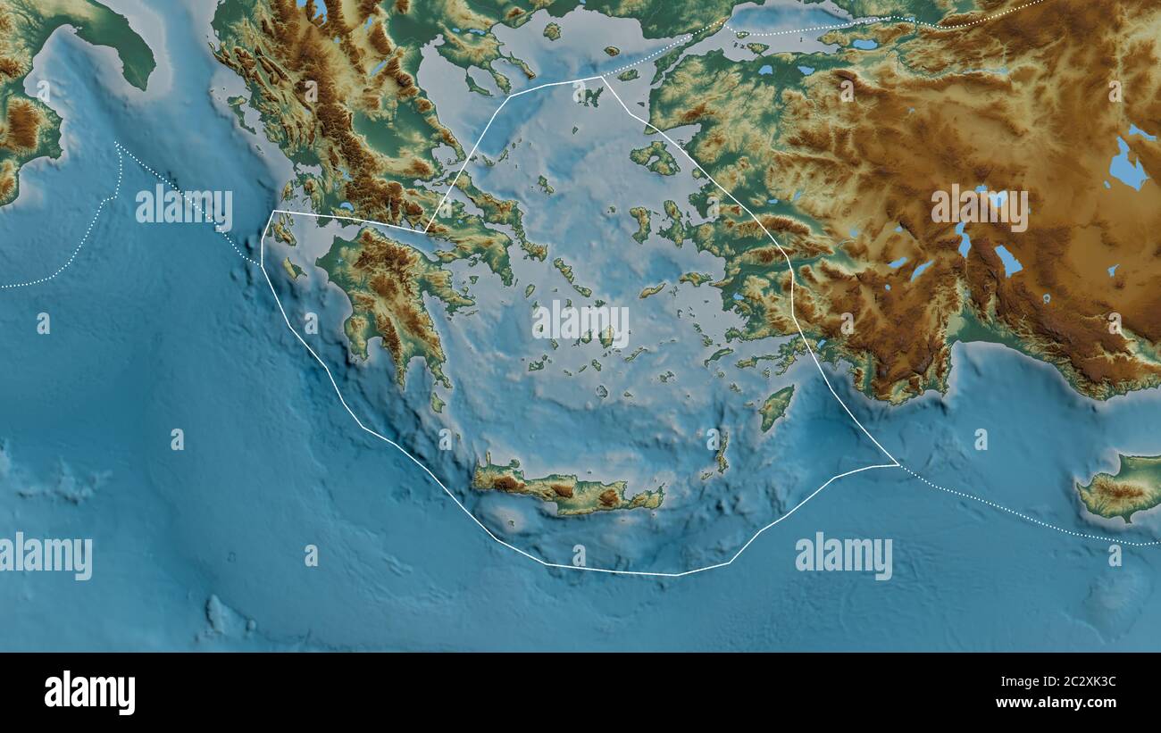 Contorno de la placa tectónica del Mar Egeo con los bordes de las placas circundantes contra el fondo de un mapa de relieve. Renderizado en 3D Fotografía de stock - Alamy