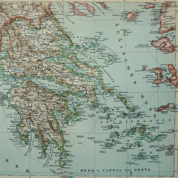 1895 Mapa antiguo de GRECIA. ATENAS. Mar Egeo. Mar Jónico. Gráfico de 128 años. - Etsy México