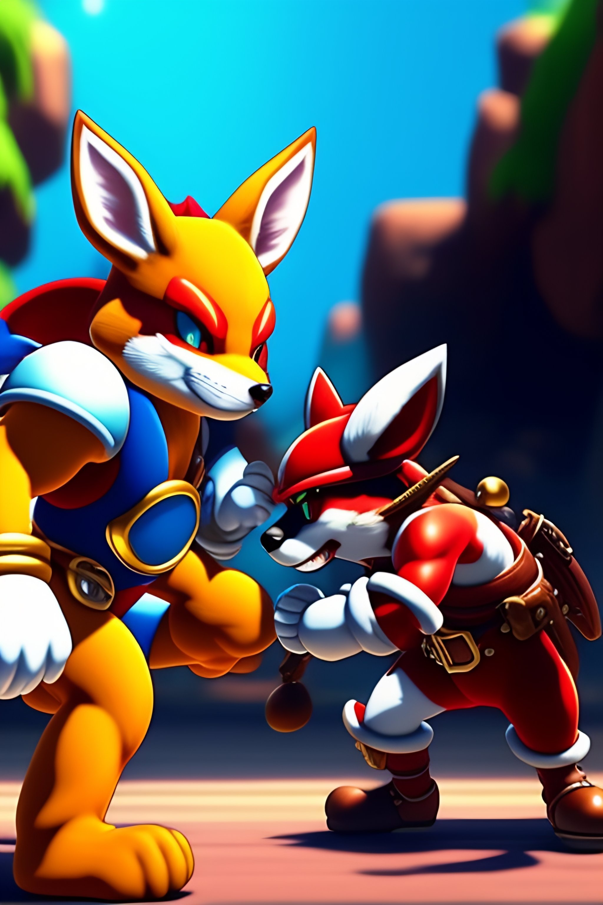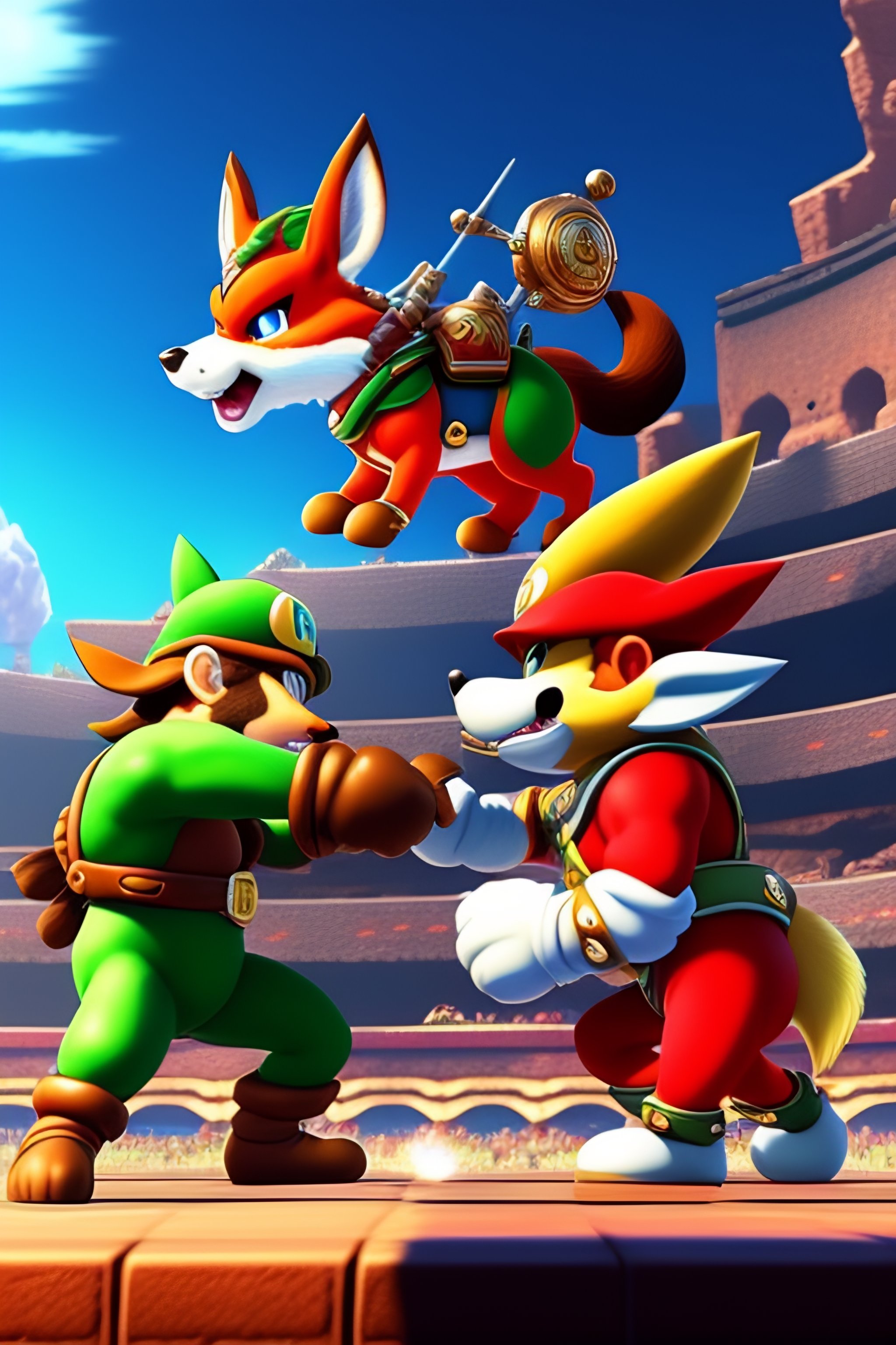 Lexica - Mario, Link, Fox from Star Fox, Greninja from pokemon and Donkey kong from the Donkey Kong series fighting each other in a Colosseum, anime ...