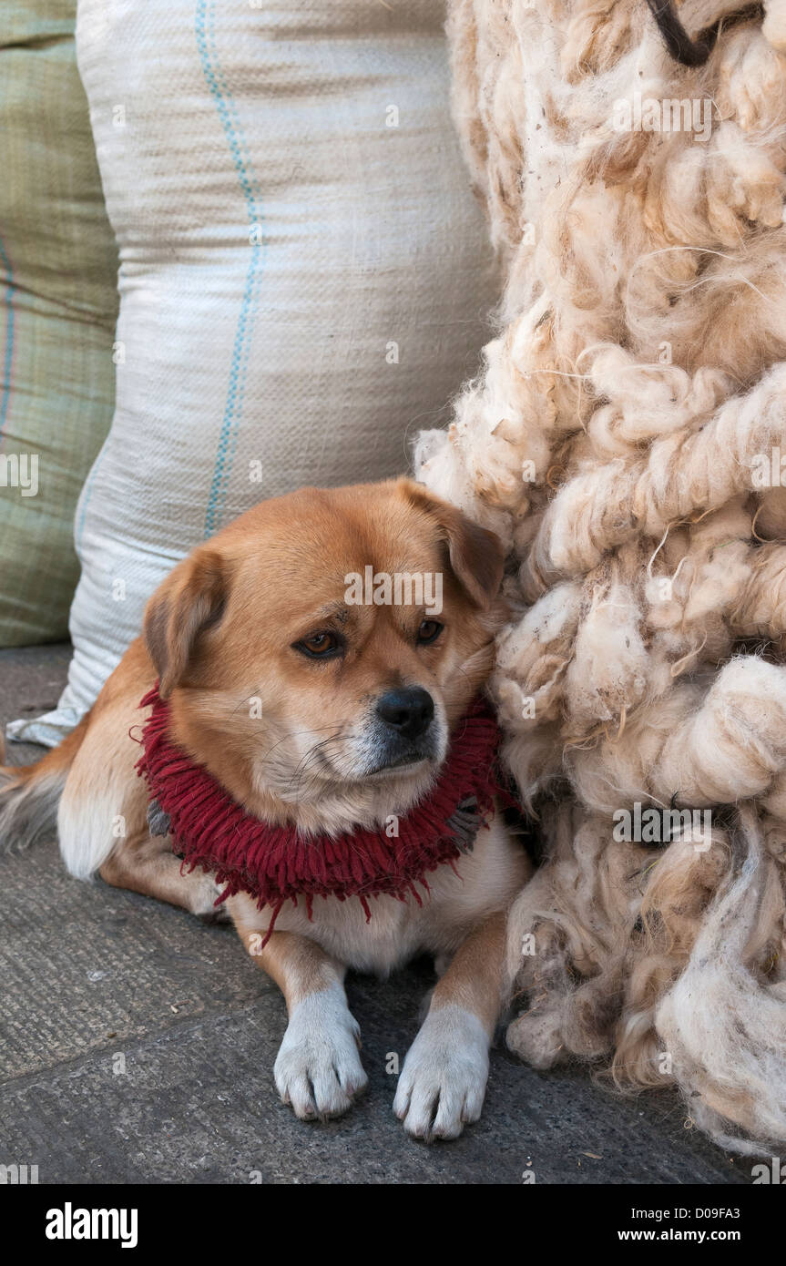 Cachorro Mastín tibetano con collar de paño rojo tradicional propietario espera junto con fardos de lana de oveja en el mercado callejero, Lhasa, Tíbet Fotografía de stock - Alamy
