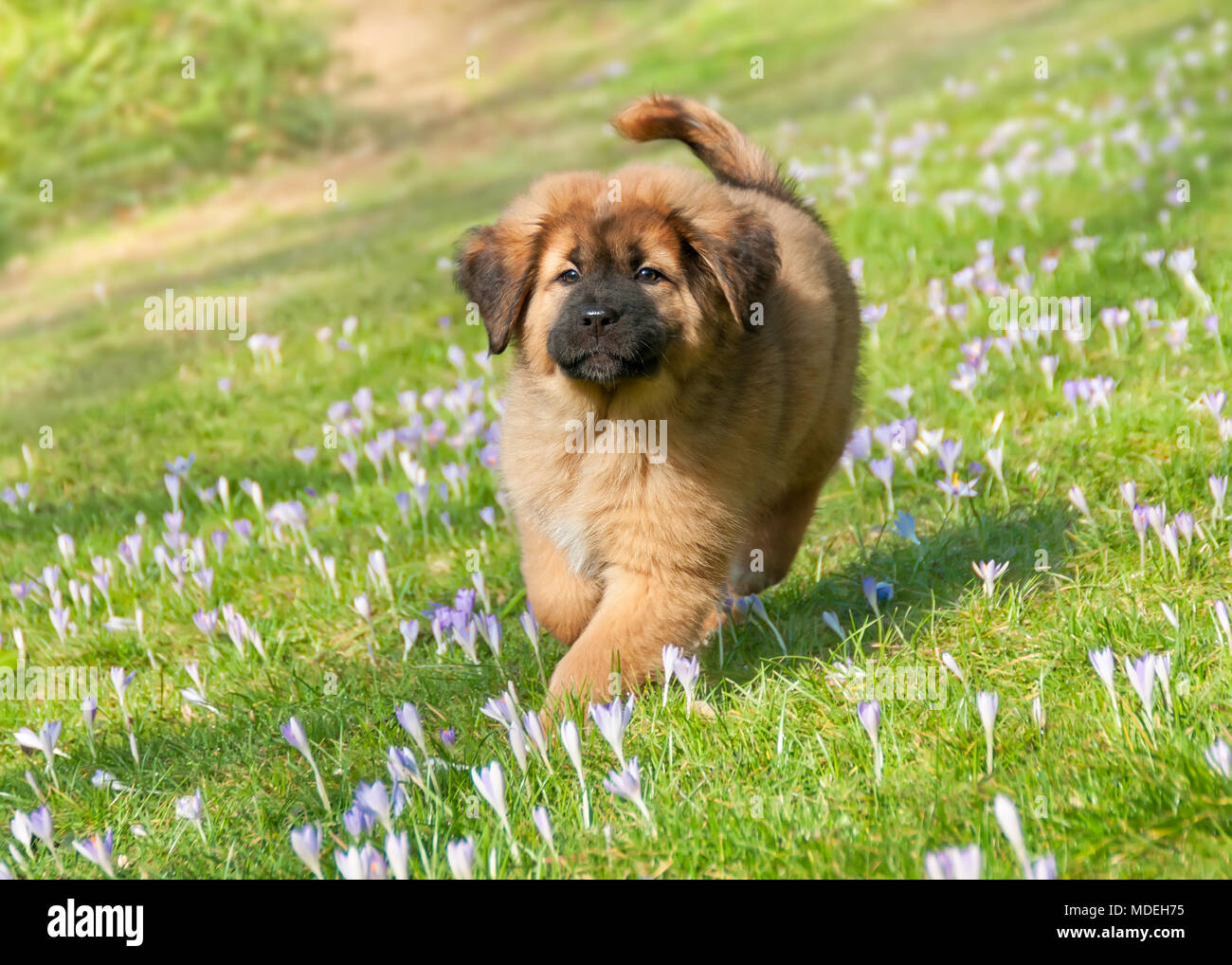 Un lindo joven cachorro Mastín tibetano que se ejecuta a través de una pradera, crocus de primavera esta gran raza de perro guardián es también llamado Do-Khyi Fotografía de stock - Alamy