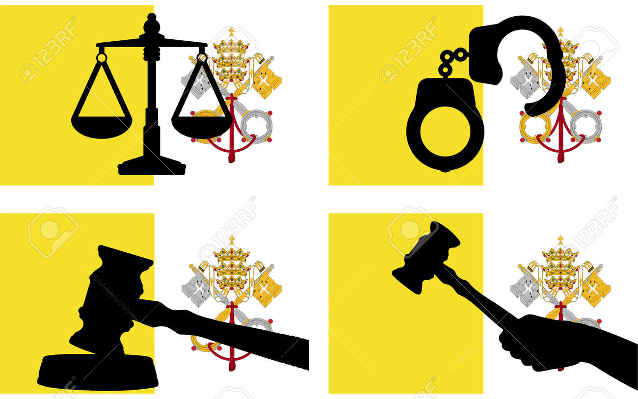 Bandera Del Vaticano Con Silueta De Vector De Justicia, Martillo De Mazo De Juez Y Balanza De Justicia Y Silueta De Esposas En La Bandera Del País, Concepto De Ley Del Vaticano,