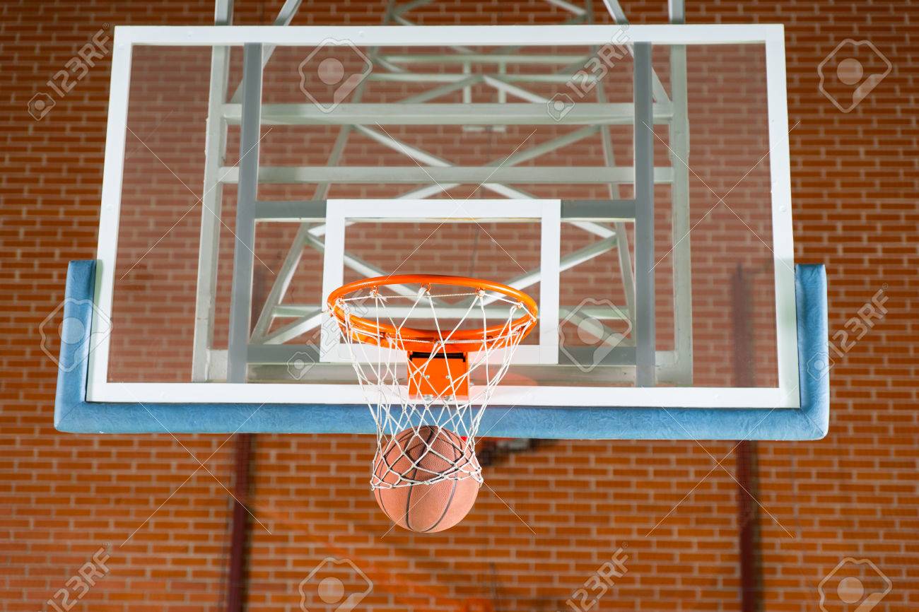 Baloncesto Que Pasa A Través De La Red En El Poste De La Portería Frente A Un Tablero Transparente En Una Cancha Cubierta Fotos, retratos, imágenes y fotografía de archivo libres de