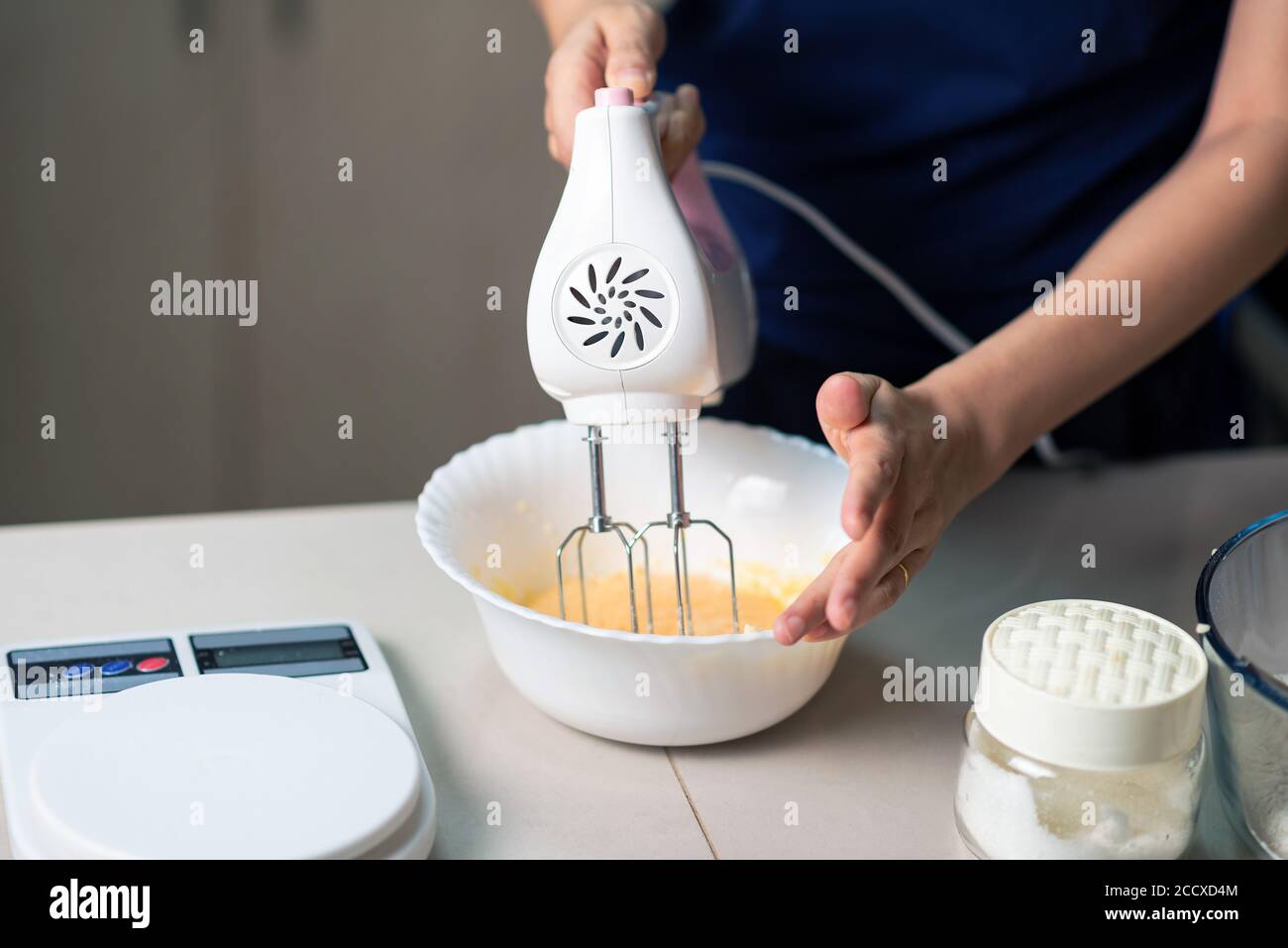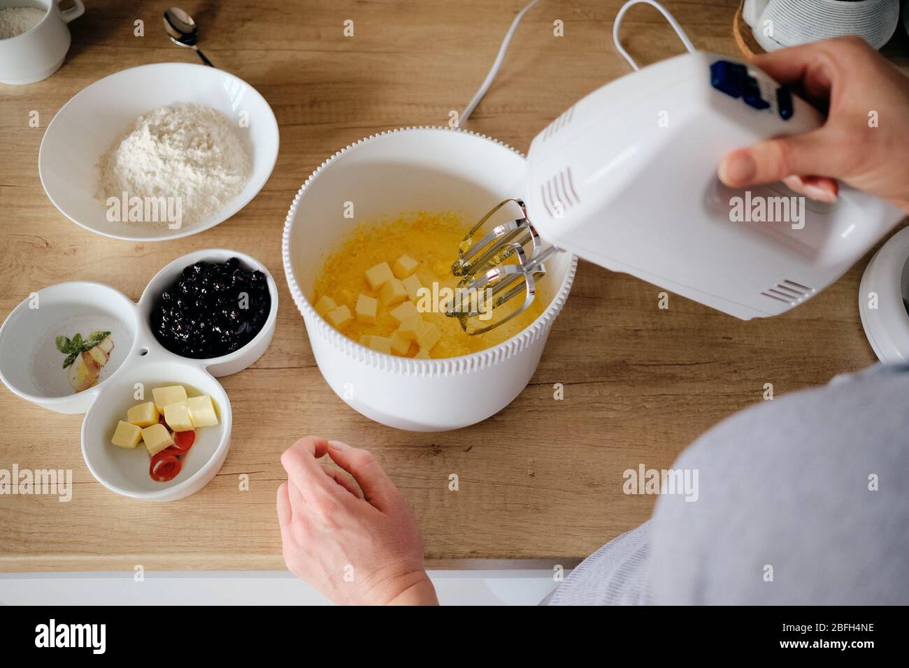 Mujer usando una mezcladora eléctrica para mezclar ingredientes para la masa de azúcar, huevos batidos, mantequilla y harina mientras se hacen galletas en la cocina en casa primer plano Fotografía de stock -