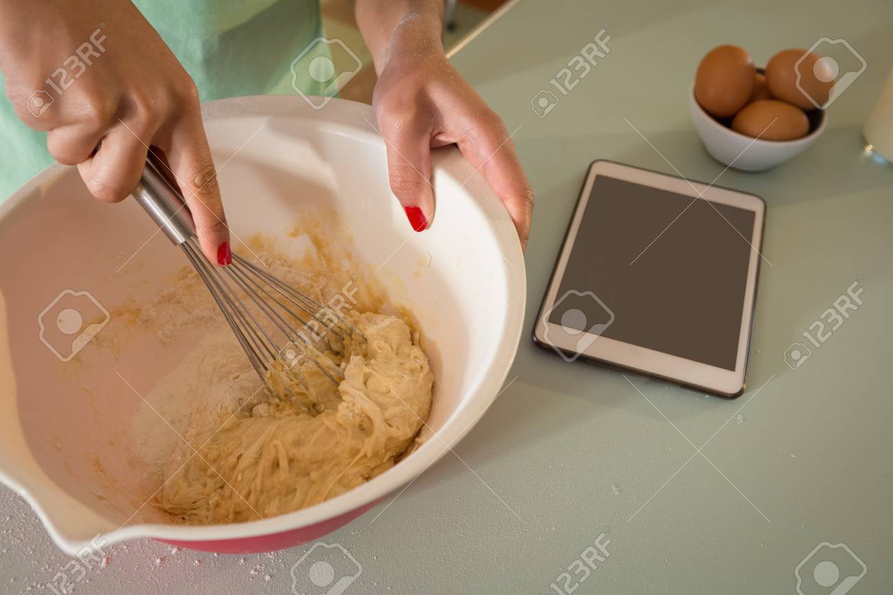 Mujer batir la mezcla en la cocina Fotografía de stock - Alamy