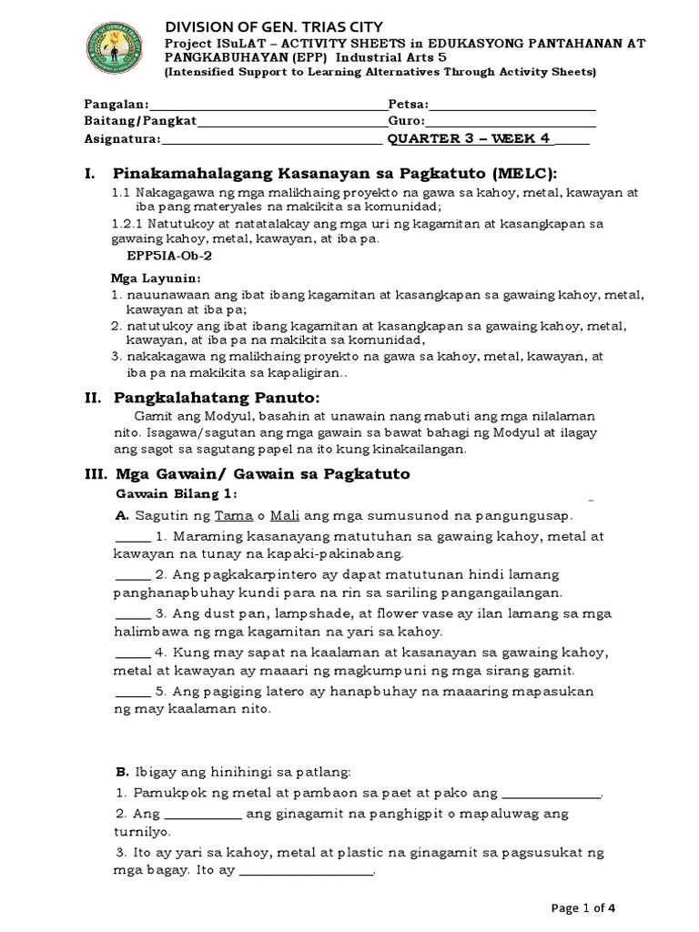 Quarter 3 - Week 4: Project Isulat - Activity Sheets in Edukasyong Pantahanan at PANGKABUHAYAN (EPP) Industrial Arts 5 | PDF