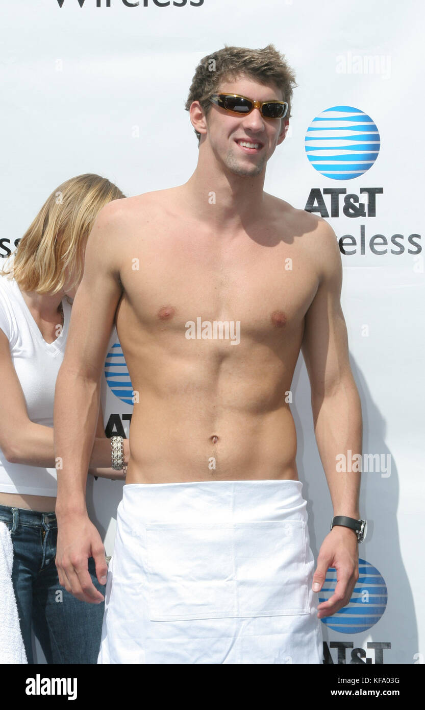Olympic gold medalist swimmer Michael Phelps gets his body painted in preparation of making a body imprint painting at a promotional appearance for At&T wireless in Tustin, CA, Octt. 5, 2004. Photo