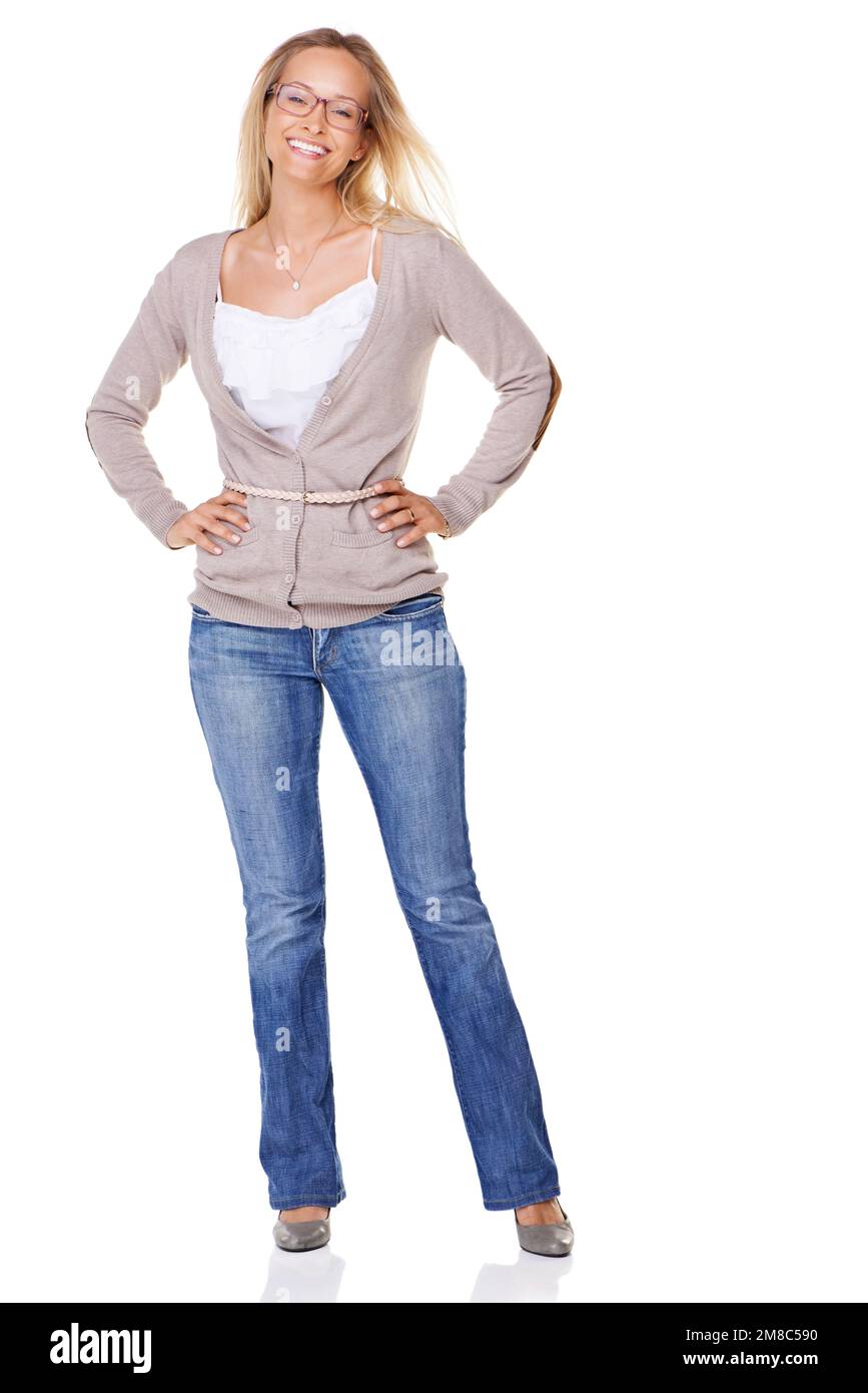 Moda, belleza y retrato de mujer sobre un fondo blanco para ropa de moda, elegante y 2000s. Estilo, cosmética y alegre, segura y femenina Fotografía de stock - Alamy