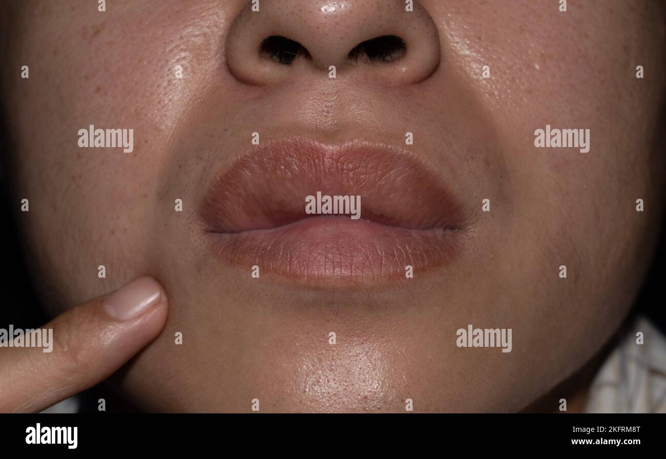 Pequeña lesión vesicular en el labio inferior del hombre asiático Fotografía de stock - Alamy