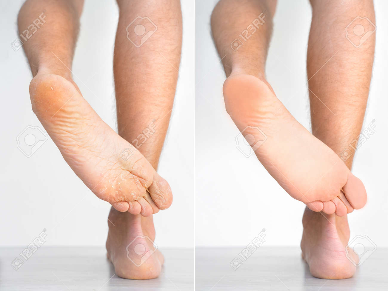 Mans Pies Con Piel Seca Antes Y Después Del Tratamiento. Infección Por Hongos O Pie De Atleta, Piel Seca, Dermatitis, Eccema, Psoriasis O Pies Sudorosos. Concepto De Salud Fotos, retratos, imágenes y