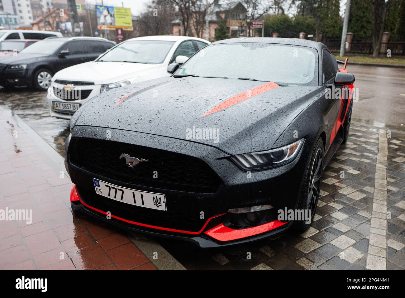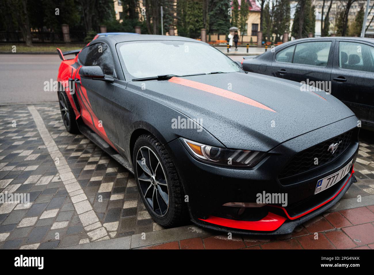 Ivano-Frankivsk, Ucrania - Marzo de 2023: Ford Mustang negro y rojo con 777 placas en la calle Fotografía de stock - Alamy