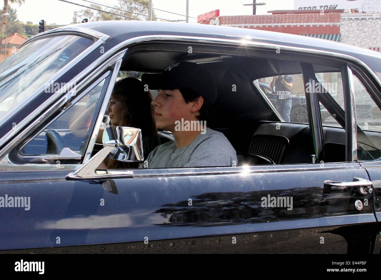 Miley Cyrus and Nick Jonas heading out for lunch together in Jonas' classic Ford Mustang. Toluca Lake, California 11.04.09 Stock Photo - Alamy