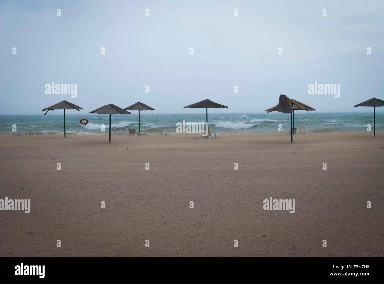 Tormenta en el mar con las nubes de tormenta. Vista sobre mar con muchas sombrillas de playa Fotografía de stock - Alamy